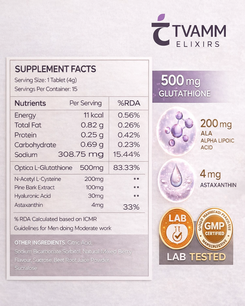 Glutathione is often referred to as the body’s master antioxidant. It helps support the skin’s natural defense against oxidative stress, promotes an even-looking complexion, and supports overall skin clarity and resilience.